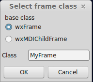 Press OK. An empty window will now appear. Press on the tiny [OK] button in the wxGlade panel and press on the frame. The button will now appear. Press on Application in the tree window.