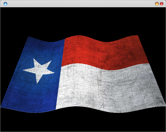 /* * OpenGL Water Effect. * It uses GLSL to create a wavey effect. * * https://talkera.org/opengl/ * http://openglsamples.sf.net/ * */ #include#include #include #include void printLog(GLuint obj) { int infologLength = 0; char infoLog[1024]; if (glIsShader(obj)) glGetShaderInfoLog(obj, 1024, &infologLength, infoLog); else glGetProgramInfoLog(obj, 1024, &infologLength, infoLog); if (infologLength > 0) printf("%s\n", infoLog); } char *file2string(const char *path) { FILE *fd; long len, r; char *str; if (!(fd = fopen(path, "r"))) { fprintf(stderr, "Can't open file '%s' for reading\n", path); return NULL; } fseek(fd, 0, SEEK_END); len = ftell(fd); printf("File '%s' is %ld long\n", path, len); fseek(fd, 0, SEEK_SET); if (!(str = malloc(len * sizeof(char)))) { fprintf(stderr, "Can't malloc space for '%s'\n", path); return NULL; } r = fread(str, sizeof(char), len, fd); str[r - 1] = '\0'; /* Shader sources have to term with null */ fclose(fd); return str; } /* Storage For Textures */ GLuint texture[3]; /* Loads in a bitmap as a GL texture */ int LoadGLTextures( ) { int Status = 0; /* Create storage space for the texture */ SDL_Surface *TextureImage[1]; /* Load The Bitmap into Memory */ if ((TextureImage[0] = IMG_Load("flag.bmp"))) { Status = 1; glGenTextures( 1, &texture[0] ); glBindTexture( GL_TEXTURE_2D, texture[0] ); glTexImage2D( GL_TEXTURE_2D, 0, 3, TextureImage[0]->w, TextureImage[0]->h, 0, GL_BGR, GL_UNSIGNED_BYTE, TextureImage[0]->pixels ); glTexParameteri( GL_TEXTURE_2D, GL_TEXTURE_MIN_FILTER, GL_LINEAR ); glTexParameteri( GL_TEXTURE_2D, GL_TEXTURE_MAG_FILTER, GL_LINEAR ); } /* Free up some memory */ if ( TextureImage[0] ) SDL_FreeSurface( TextureImage[0] ); return Status; } int main(int argc, char **argv) { SDL_Event sdlEv; Uint32 sdlVideoFlags = SDL_OPENGL; Uint8 quit; char *extensions; int i, j; /* Initialize */ if (SDL_Init(SDL_INIT_VIDEO) = nextUpdate) { fprintf(stderr, "FPS: %d\n", frameCount); frameCount = 0; nextUpdate = SDL_GetTicks() + 1000; } } glDeleteShader(vs); glDeleteShader(fs); glDeleteProgram(sp); return EXIT_SUCCESS; } Running it should result in an animation as: